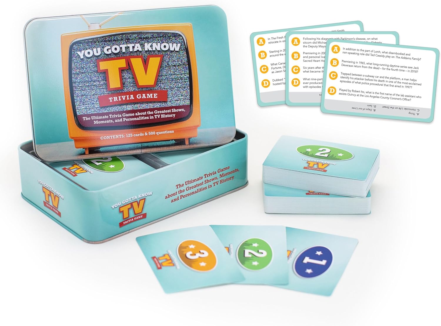 You Gotta Know TV is the addictive trivia game with 500 fun questions about the most iconic TV moments of all time. Learn more about the personalities, sitcoms, series, programs and moments that made an indelible mark on generations of Americans! Packaged in a 7x5x3" metal tin that makes it perfect for gifting and storage! 125 trivia cards with 500 questions about the TV history Easy "Race to 21" game play A great way to learn about and remember the greatest shared moments from the golden age of TV through today Packaged in a unique metal tin that makes it perfect for gifting!