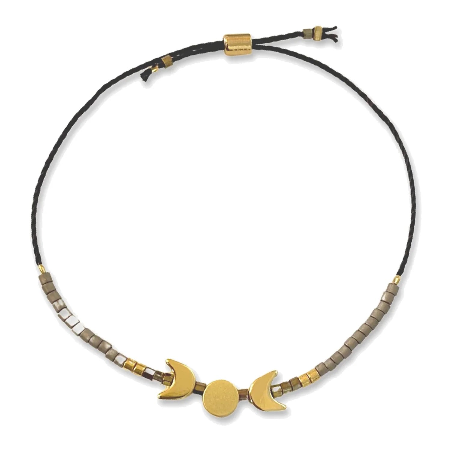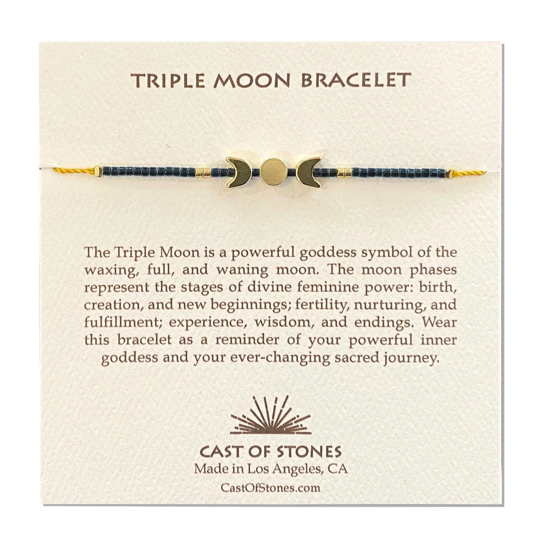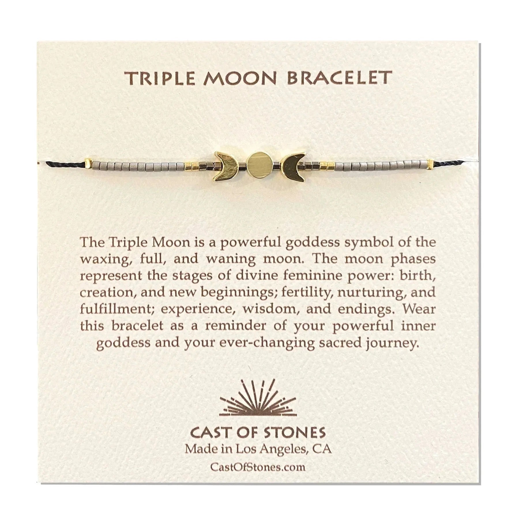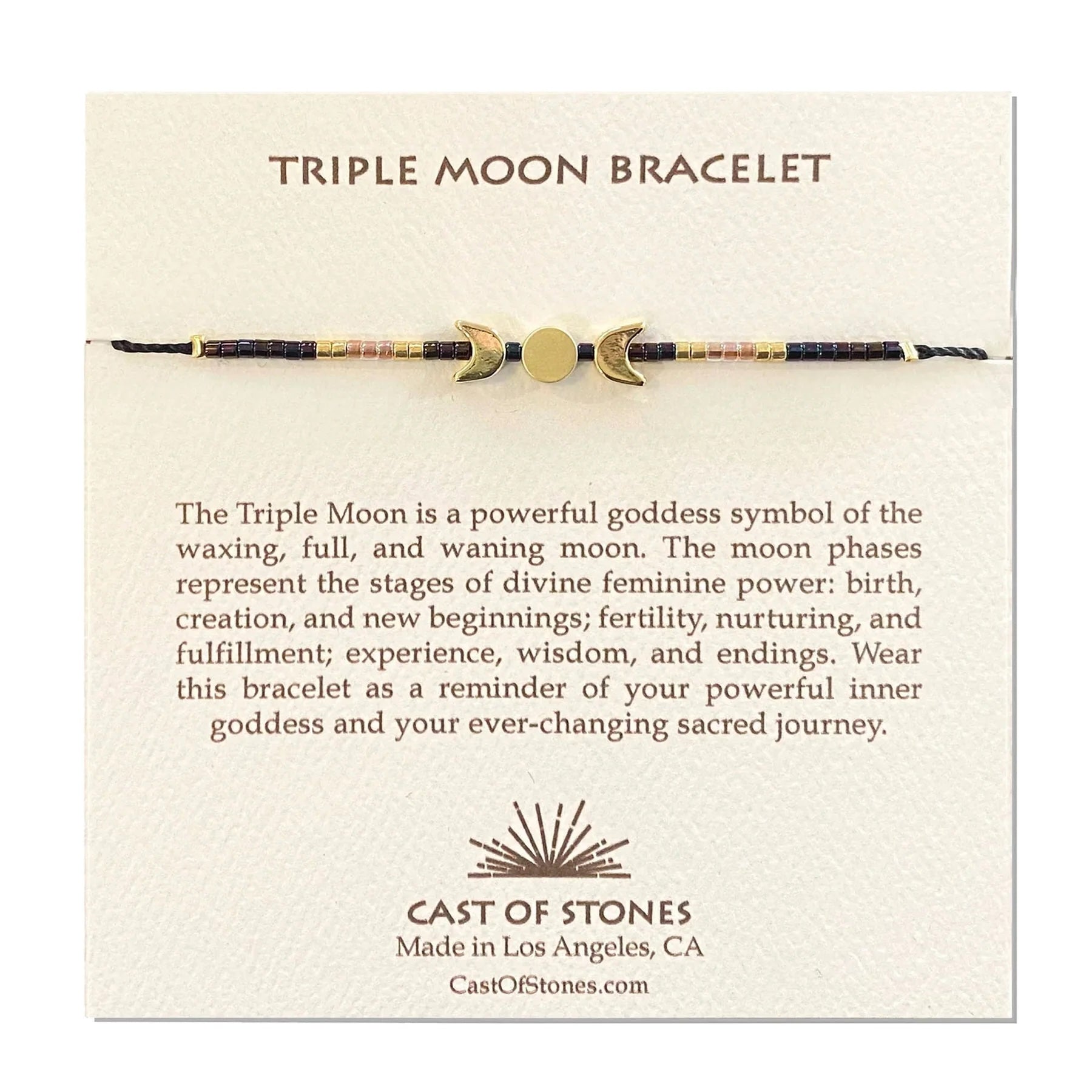 The Triple Moon is a powerful goddess symbol of the waxing, full, and waning moon. The moon phases represent the stages of divine feminine power: birth, creation, and new beginnings; fertility, nurturing, and fulfillment; experience, wisdom, and endings. Wear this bracelet as a reminder of your powerful inner goddess and your ever-changing sacred journey.