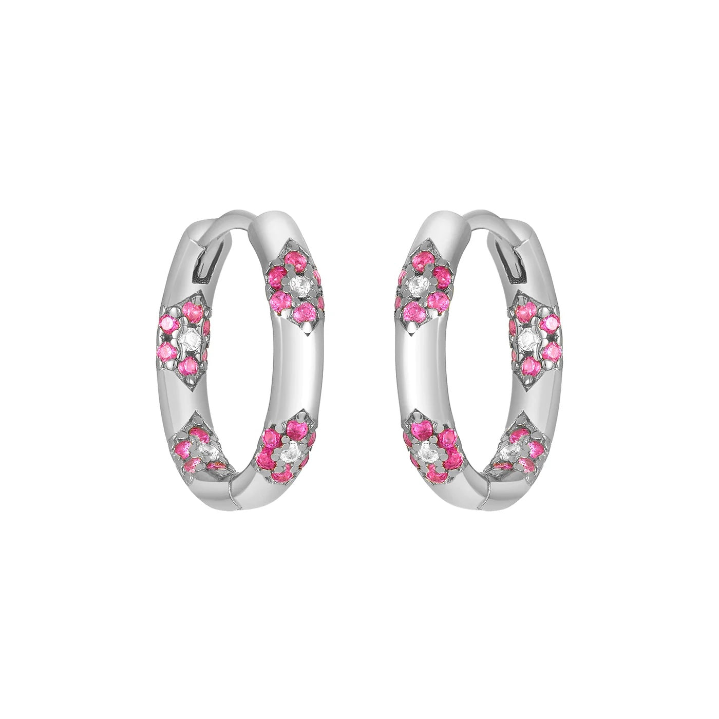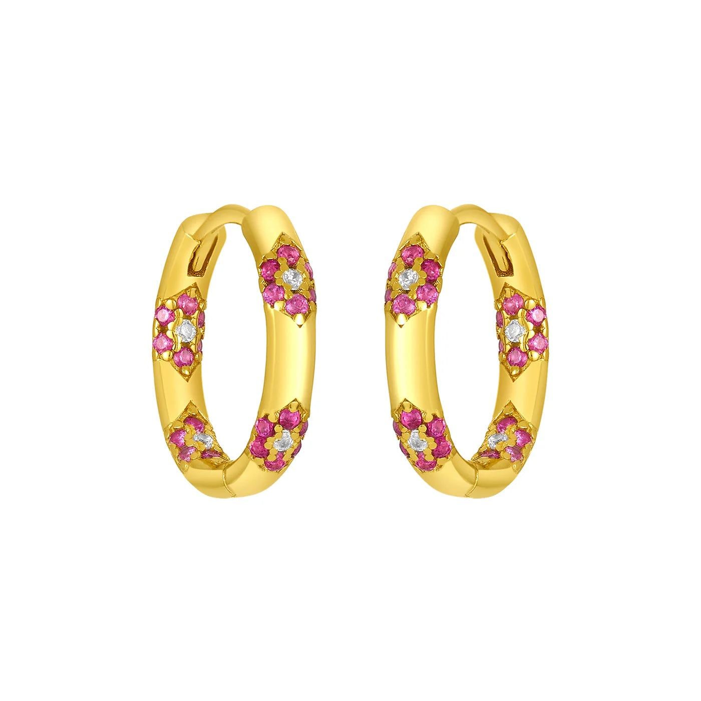 Crafted from 925 sterling silver and plated with elegant 18k gold, the FYB - Fuchsia Delia Huggies Earrings feature sparkling cubic zirconia stones set in a refined 14mm diameter design. These huggie earrings combine durable precious metals with brilliant clarity, offering both style and lasting quality for a sophisticated look.