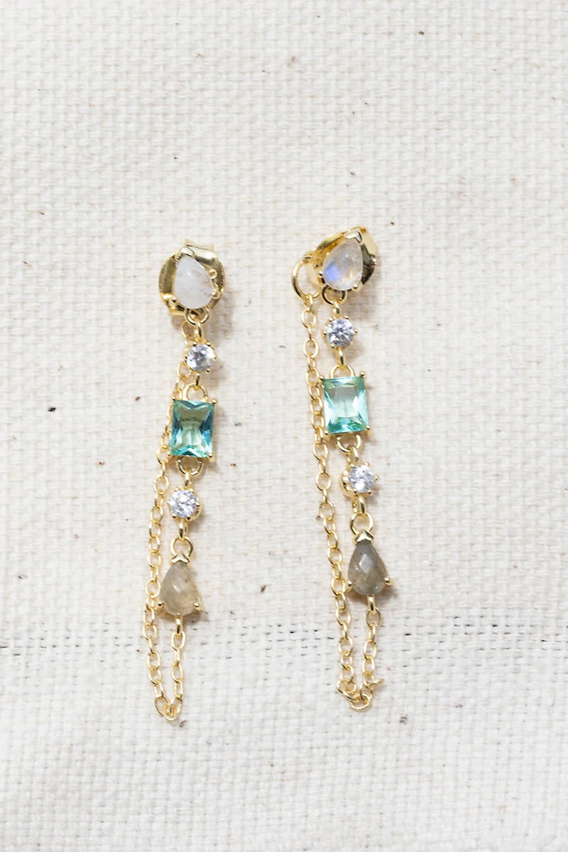 These dainty 14K gold vermeil earrings feature a delicate chain adorned with paraiba and cz. Measuring 2.5 inches, their unique, lightweight design makes them an effortless addition to your ear stack.