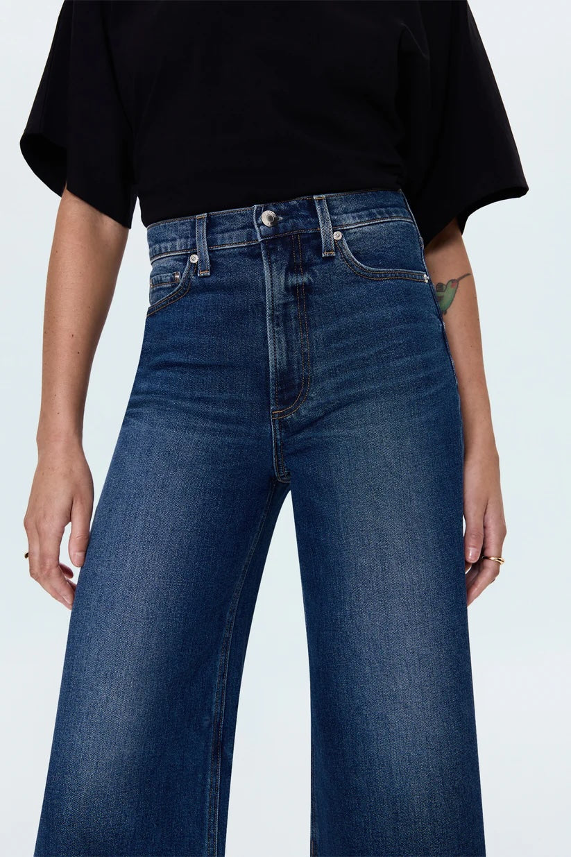 The wide leg that commands the room. Lana Crop sits as a high rise with an ultra wide leg silhouette and breezy cropped 27" inseam that feels effortlessly dramatic. The raw finished hem adds authentic texture while the relaxed fit creates stunning proportions. Crafted from our signature comfort stretch denim in Broadway a dark wash, enhanced by subtle fading and whiskering.