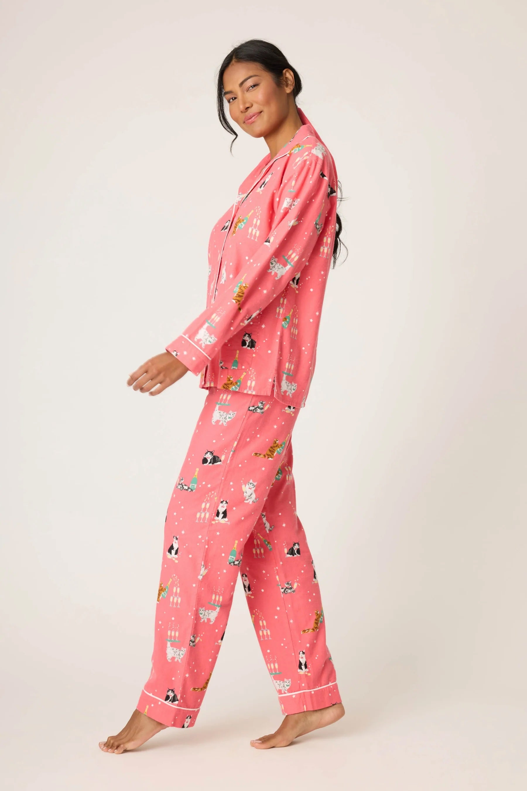 Feel-ine festive, this three-piece flannel set is made from soft cotton in a classic twill weave, complete with a button-front top, relaxed drawstring pants, and a matching headband. The coral backdrop is covered in cats sipping champagne and clinking flutes, finished with contrast piping and a cuff that cheekily reads “Let’s Get Fizzical”—purr-fect for holiday lounging, bubbly nightcaps, and curling up for a catnap.