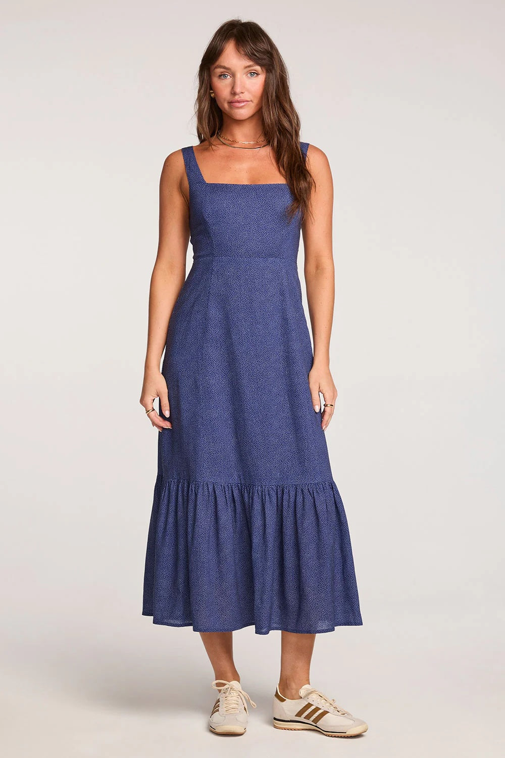 The Lilith Midi Dress features a square neckline and wide straps for a timeless, classic appeal.
