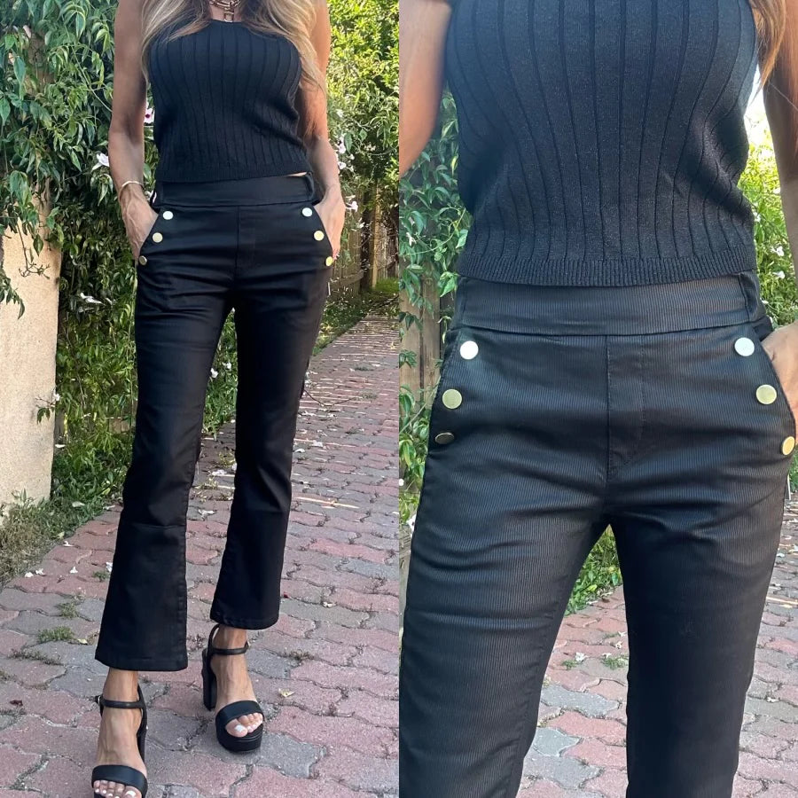 The Bevy Flog Sofia Crop Pant in Black offers a sleek, structured fit with a subtle cropped flare. Designed with belt loops, decorative front buttons, these pants are perfect for polished yet effortless styling. Pair them with heels for a dressy look or sneakers for everyday wear.