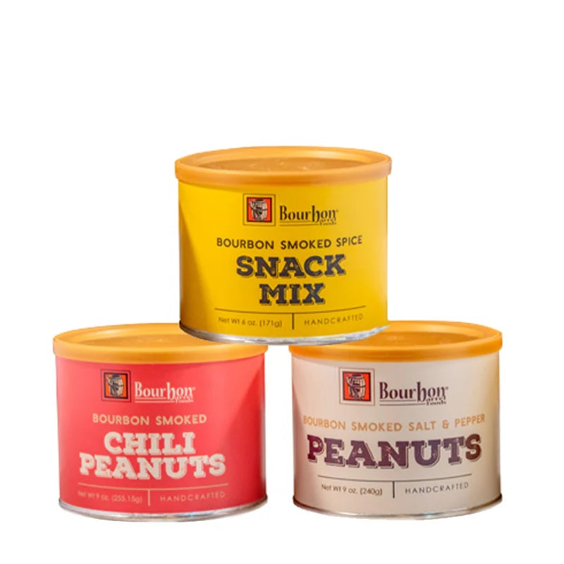 Bourbon Smoked Snack Trio includes Bourbon Barrel Foods’ most popular snacks, Bourbon Smoked Sea Salt and Pepper Peanuts, Bourbon Smoked Spiced Snack Mix, and Bourbon Smoked Chili Peanuts. This trio makes a great gift if you’re willing to share!