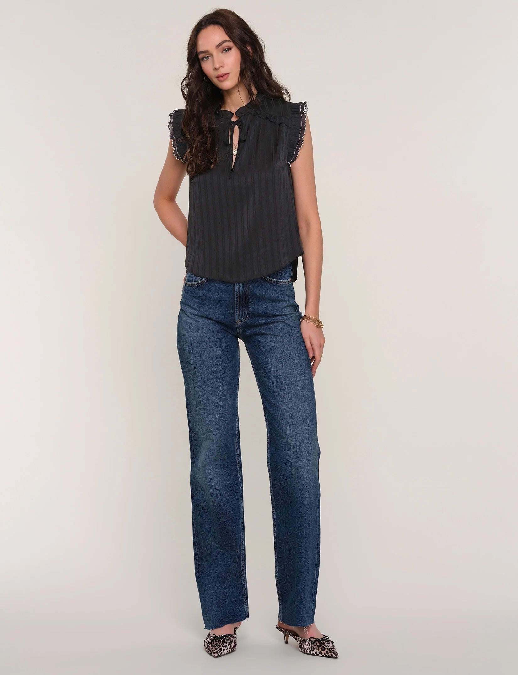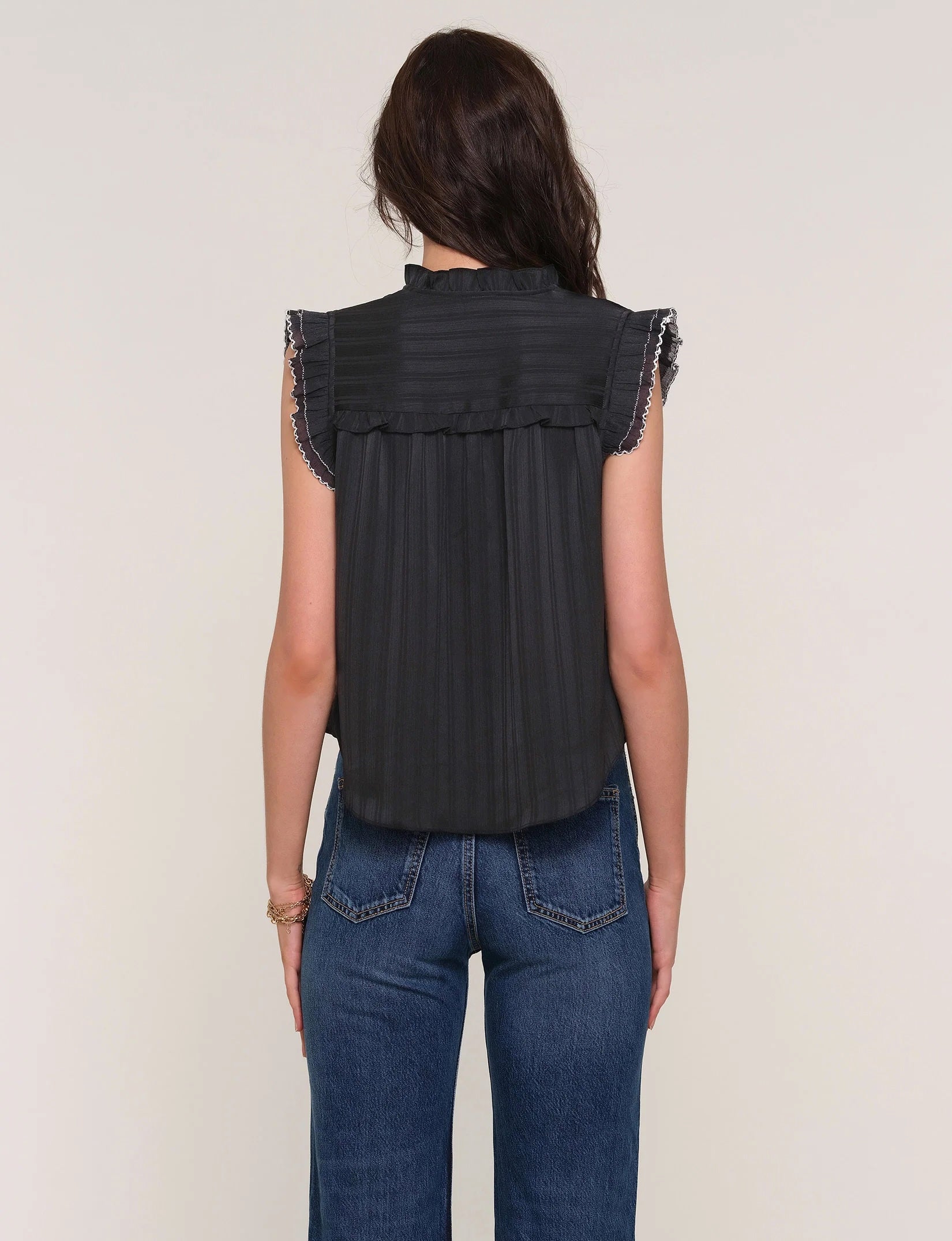 The Ananda Top is a pretty and feminine, sleeveless blouse made from a soft, hammered satin. It features delicate ruffles with contrast finishing and self-tie at the center front.