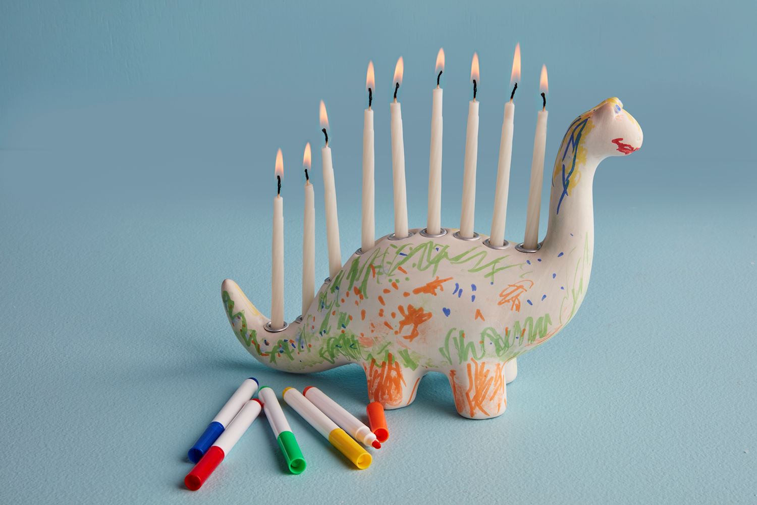 4-piece set. Menorah with holes to hold Hanukkah candles comes with pack of markers, paint pots and brush to make it your own.