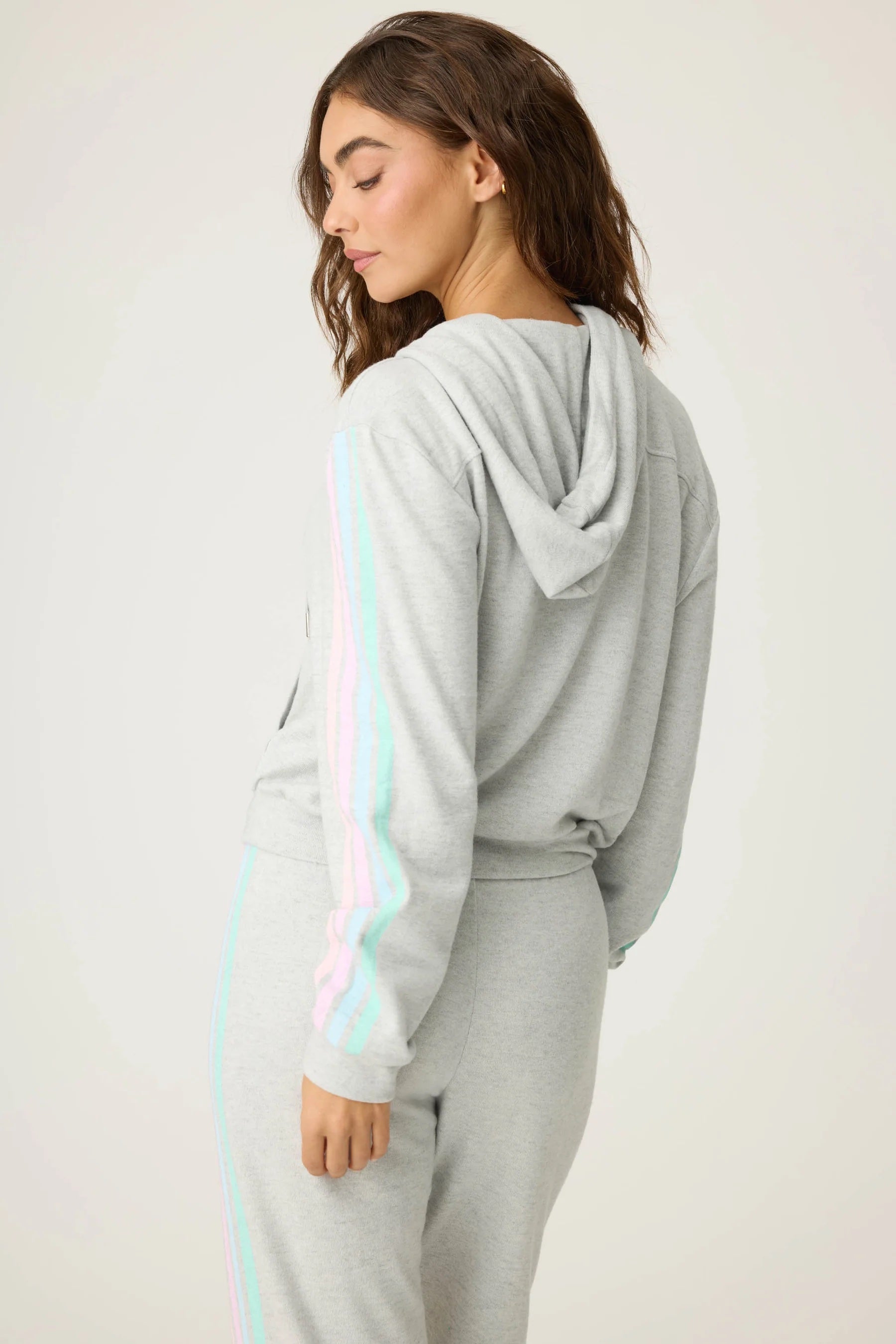 Show your summer stripes in this grey zip‑front hoodie, refreshed with pastel sleeve stripes in sweet candy‑colored hues. Crafted from heavy peachy jersey, it delivers a relaxed fit and handy front pockets for stashing essentials. Whether you’re grabbing a sunrise coffee or winding down at sunset, this hoodie brings an easygoing, sporty vibe to your day.